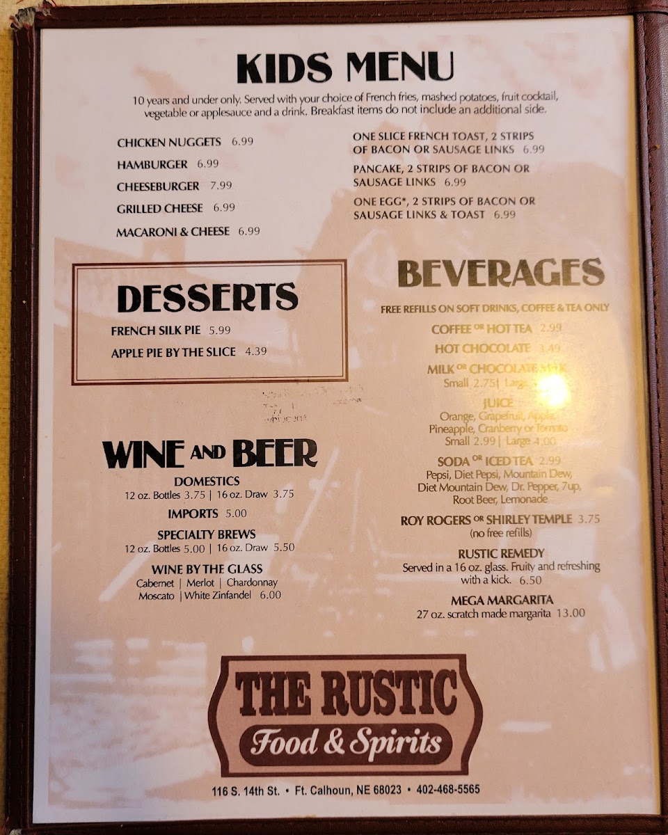 Introducing the menu at The Rustic, a cozy eatery located at 116 S 14th St in Fort Calhoun, NE, you’ll find a delightful array of breakfast options and hearty dishes that celebrate comfort food with a rustic flair. The menu showcases an impressive selection of omelets, ranging from the classic Cheese Omelet ($10.99) to the spicy Jalapeno Omelet ($13.99). Each dish is crafted with fresh ingredients, exemplifying the restaurant's commitment to quality.